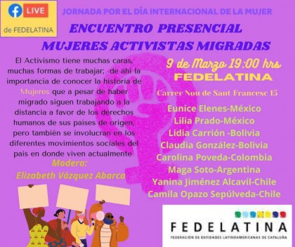 Encuentro de Mujeres Activistas Migradas Encuentro de Mujeres activistas migradas, diferentes orígenes y sensibilidades hablando de aquí y de los países de origen… pero todas con un objetivo en común: defender la igualdad y la justicia social, en especial, la de los colectivos más vulnerables. Vea la publicación de Facebook