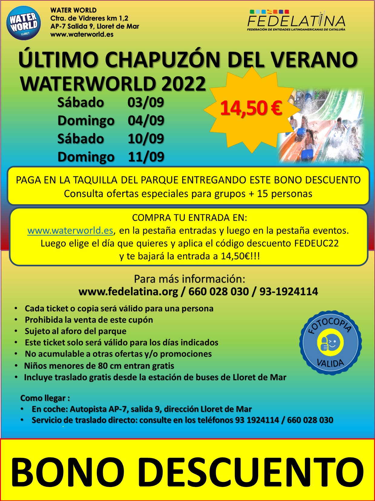 2.- COMPRA POR INTERNET: -abre la web del parque www.waterworld.es, – ve a la pestaña de EVENTOS y encontrarás nuestra promoción y antes de pagar dirá 35€ , pero cuando apliques el código de descuento WWFEDE21 el precio bajara a 13€ por persona.